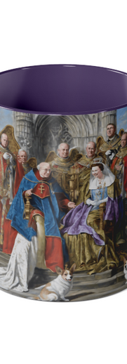 painting of Archbishop of Canterbury and Queen Elizabeth II are seated next to each other, Archbishop of Canterbury seated on the right and raises his arm, blesses Queen Elisabeth II, Welsh corgi Pembroke in front of them in gesture of devotion, T-pose, portrait of Queen resembling Virgin Mary, two angels protect Queen Elizabeth II, London in background, Gothic cathedral.